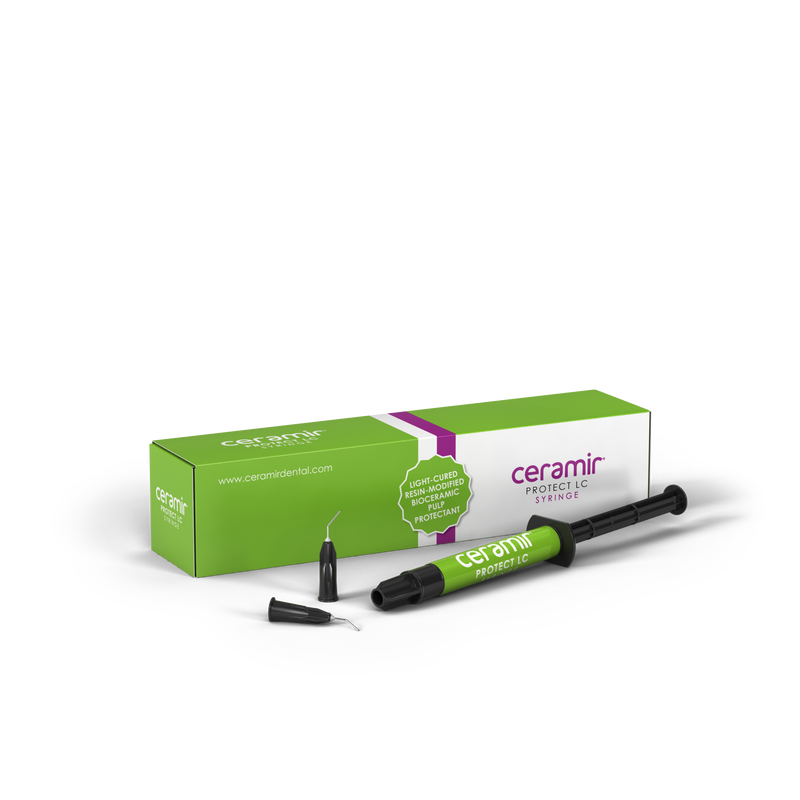 Ceramir® Protect LC - Syringe is a light-cured, resin-modified Bioceramic pulp protectant for direct and indirect pulp capping. The significant release of calcium on moist tooth surfaces promotes the formation of hydroxyapatite as well as tertiary dentin, leading to safe pulp protection. A high alkaline pH level creates an environment hostile to bacteria, which is conducive for healing and protects against hypersensitivity.