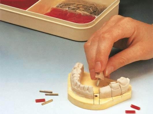 Unique: allows easy removal of model section to be worked upon and makes repositioning with absolute precision possible. Advantage: simplifies work for the dental Technician and offers absolute precision. Crosspin® has a double profile; a cylindrical part which is introduced in the “tooth part” of the model and a cross-shaped part which with its sleeve is introduced in the “base part” of the model. The sleeve will stay in the base part and the desired section can thus be removed and replaced with absolute precision.