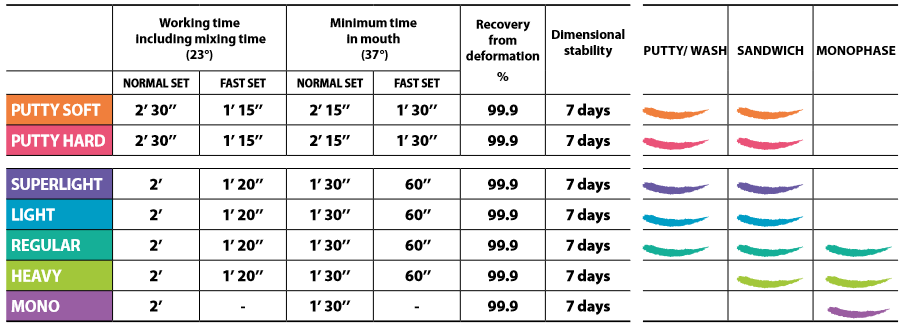 Ghenesyl new generation addition curing “polyvinylsiloxane” silicone guarantees, thanks to its specific characteristics, maximum precision in detecting details (25 µm) even in a wet setting. The different hardnesses and consistencies allow to obtain optimal results by adapting to every need and impression taking technique. The long processing time allows you to manage the product, and at the same time the short stay in the mouth guarantees maximum patient comfort during the impression taking. Ghenesyl adapts perfectly to the anatomical shape of the dental structures and soft tissues, thus allowing the reproduction of intact and perfect margins.