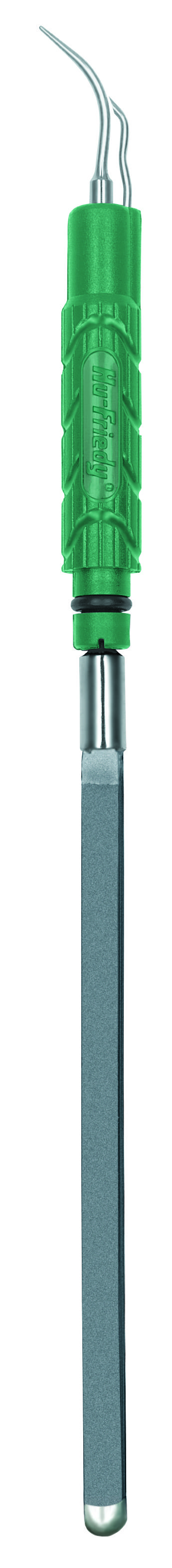 The prophy style supragingival tip is the original ultrasonic insert design with a finely beveled external water delivery tube. The Plus design features a fixed water delivery tube in a lightweight resin handle.