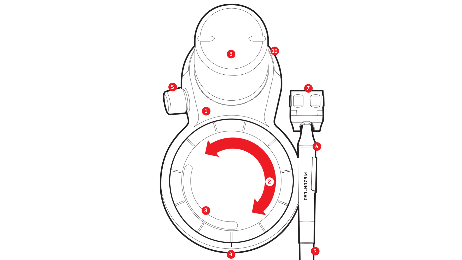 1} Original Piezon® technology inside {2 Finger-tip power control 3} Soft perio power zone {4 Power level LED indicator 5} High-precision fluid regulator {6 Original Piezon® LED handpiece 7} Original EMS Swiss Intruments PM in CombiTorque® {8 Quick-connect bottle 350 and 500ml 9} Handpiece hose with easy-fit connectors {10 Peristaltic pump quick-clip cover
