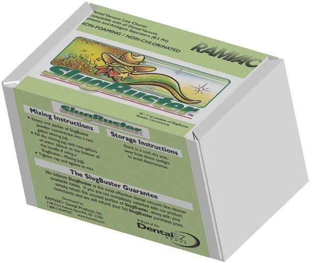 The SlugBuster™ dental vacuum line cleaner formula contains CHELATORS, which help hold heavy metals, such as Mercury, in suspension, facilitating safer discharge to waste disposal. Chelators also make the water soft - soft water cleans better than hard water. The formula also contains WETTING AGENTS specially formulated to allow the cleaner to penetrate faster.